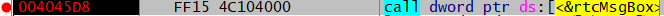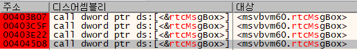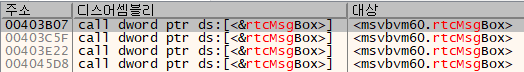 해당 프로그램의 모듈간의 호출을 찾아 rtcMsgBox 함수를 필터링하니 rtcMsgBox 함수가 네번 호출된 것을 알 수 있다.