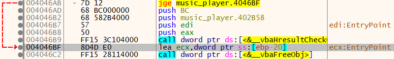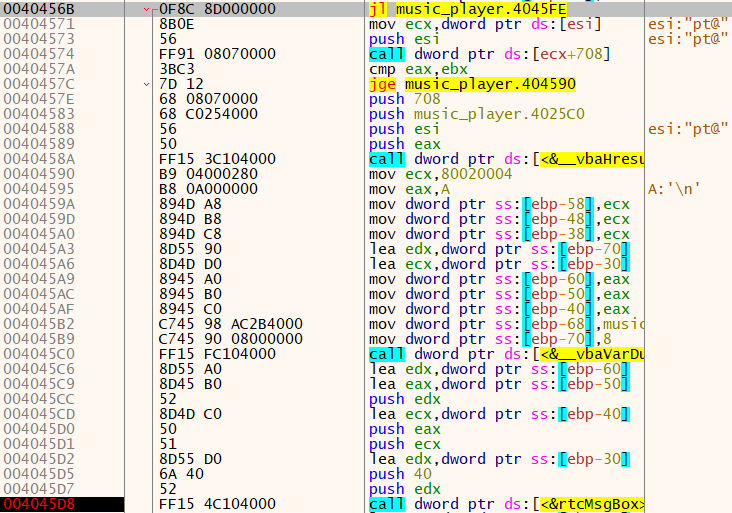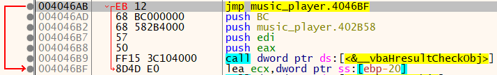4046BF 주소를 보면 해당 주소 바로 위에 __vbaHresultCheckObj 함수가 있다. 해당 에러는 아래 명령문 중 vbaHresultCheckObj로 인해 호출되고 있었다. 그리고 해당 호출은 004046A7의 test eax, eax로 인해 실행되었다. 4046AB 주소의 Jump 문으로 __vbaHresultCheckObj 함수를 실행시키지 않도록 해야한다.