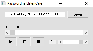 1분 넘게 음악을 실행해도 팝업창이 뜨지 않으며 Password는 LIstenCare이다.