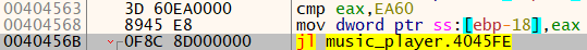 점프를 위한 비교문은 404563 주소의 cmp eax, EA60가 있다. 그렇기 때문에 eax가 EA60보다 더 작아야 한다.