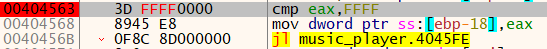 4045D8 위에 40456B 주소와 0040457C 주소에 JUMP 문이 있다. 40456B의 점프문에서 점프하면 004045FE 주소로 점프하기 때문에 팝업창을 띄우는 4045D8로 도달하지 않는다. 즉, 0040456B에서 무조건 점프를 하는 코드로 수정해야한다. 40457C 주소의 점프문은 점프 유무에 무관하게 팝업창을 띄우는 4045D8로 도달한다. 40456B에는 Jl 어셈블리 명령어가 있다. Jl 명령은 비교 대상이 더 값이 작다면 점프하고, 그렇지 않다면 점프하지 않는다. 무조건 점프를 시켜야 하므로 비교 대상의 값이 더 작도록 수정해야한다.