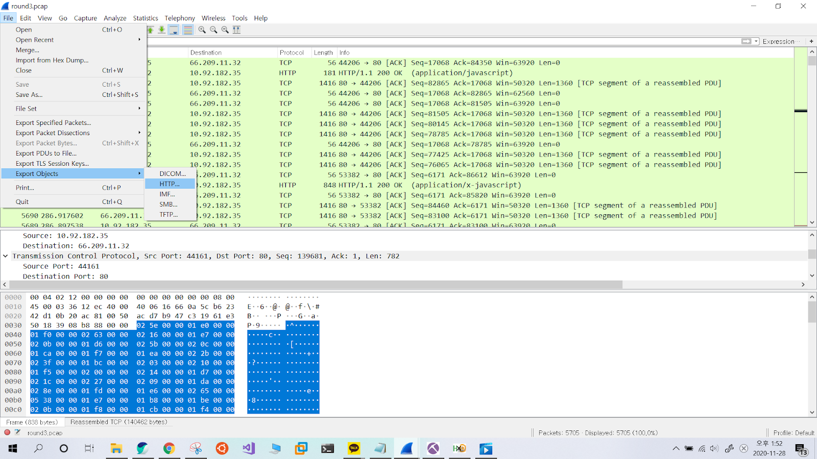 Http 프로토콜을 통해 오고간 파일들을 보기 위해 Export Objects로 살펴보았다.