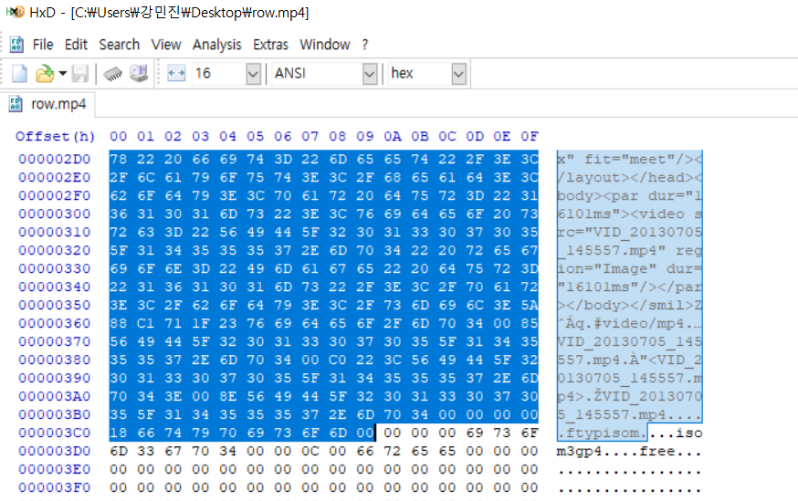MP4 시그니처가 시작되는 부분의 앞 내용은 필요없으므로 삭제 후 저장한다.
