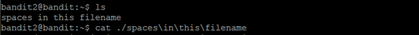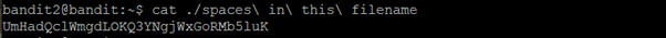 The password for the next level is stored in a file called spaces in this filename located in the home directory -비밀번호가 홈디렉터리 안 spaces in this filename이라고 불리는 파일안에 있음.