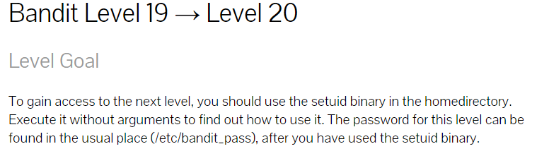 이 레벨의 비밀번호는 setuid 바이너리를 사용한 후 일반적인 위치 (/ etc / bandit_pass)에서 찾을 수 있습니다.