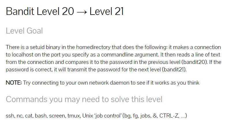홈 디렉터리에는 setuid binary가 있다: 이것은 너가 집중하고자 하는 포트의 localhost와 명령어를 사용하는 것과 같이 연결을 해준다. 그러면 그것은 텍스트를 읽고 전단계(bandit20)의 패스워드와 비교해 만약 패스워드가 맞다면