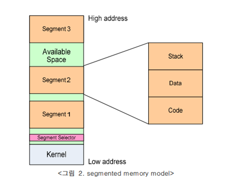 하나의 프로세스 실행시 프로세스를 segment 단위로 묶어서 가용 메모리에 저장