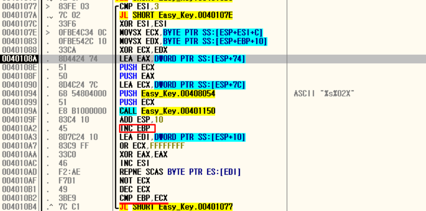 한번 돌때 EBP를 1씩 증가해서 EBP와 ECX의 값이 같아지면 탈출 하라는 내용이다