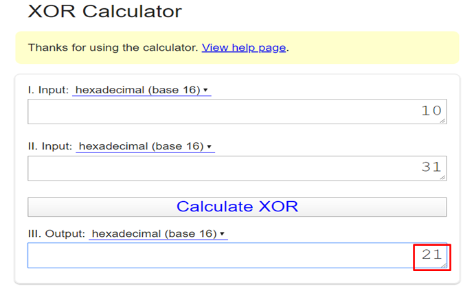 XOR 계산기를 사용하였는데, 결과 값이 21이 나왔다