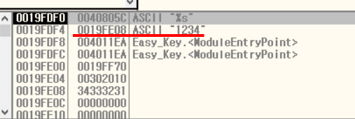 이후에 이렇게 1234과 다음과 같이 하단의 창에 값이 0019FE08에 입력이 된 것을 볼 수 있다