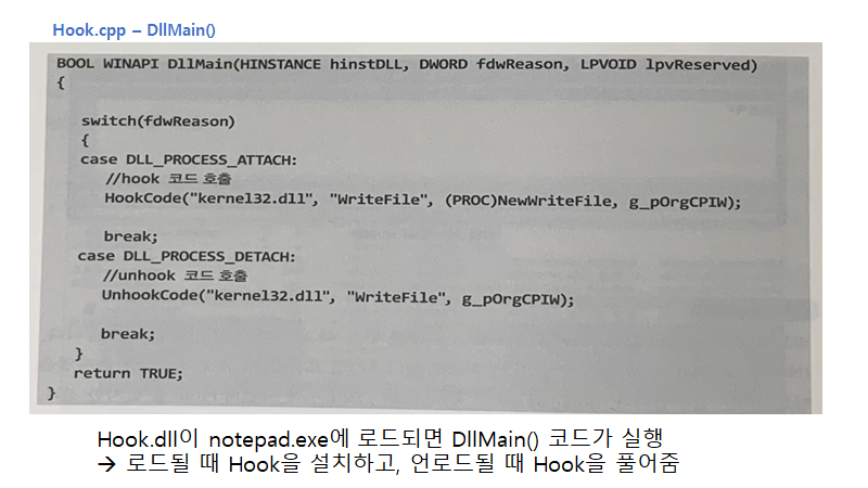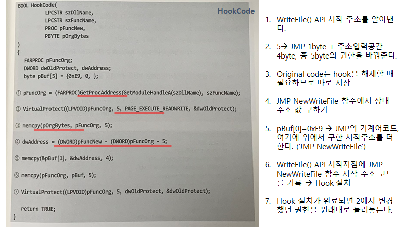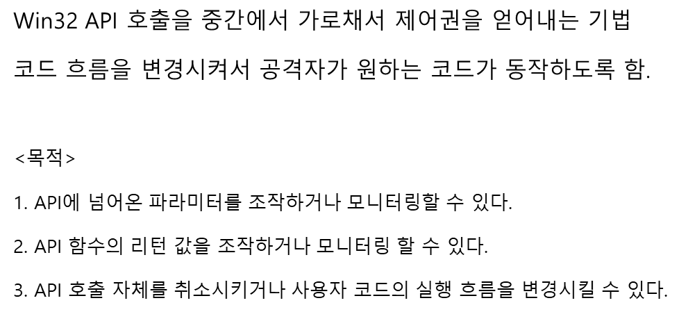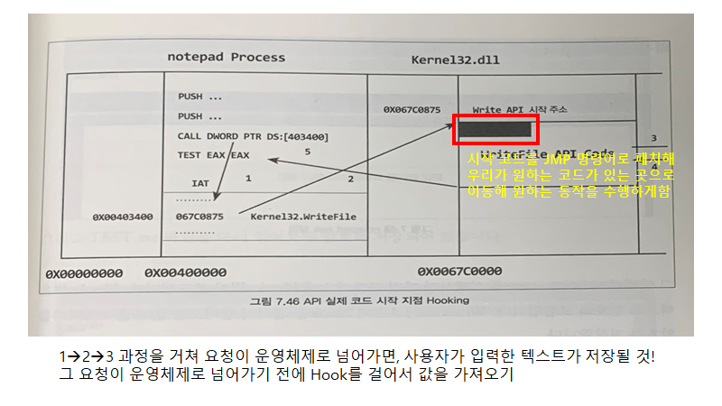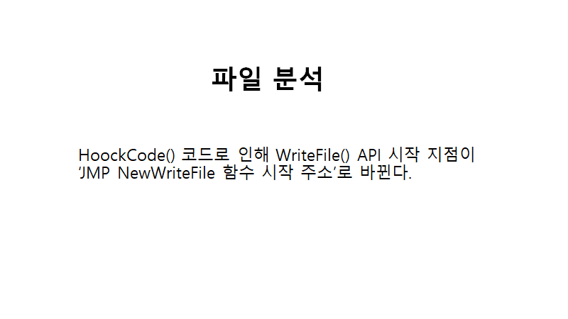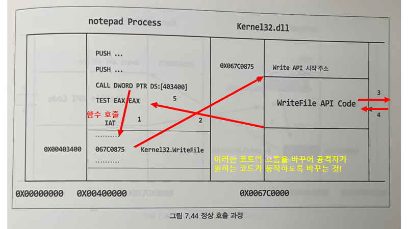 함수 호출 시에 IAT에 저장된 ex) WriteFile() 함수의 라이브러리 주소로 이동하는데, 이를 바꾸게 되면 이 함수를 호출할 때마다 코드의 흐름이 변경된 주소로 이동함