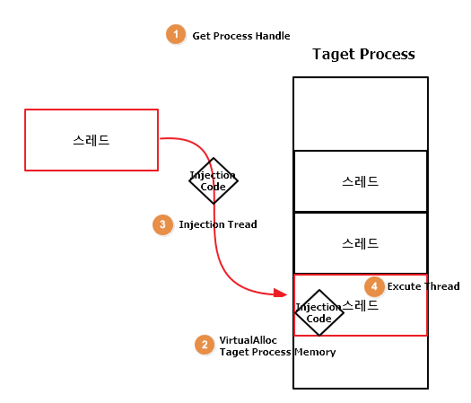 타깃 프로세스에 독립 실행 코드를 삽입한 후 실행하는 기법