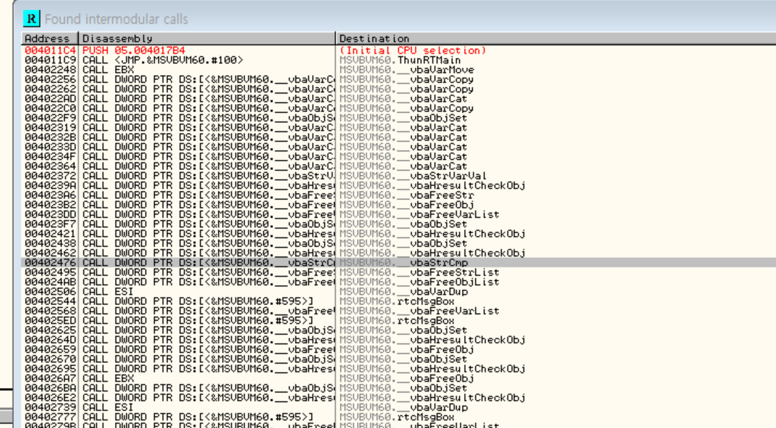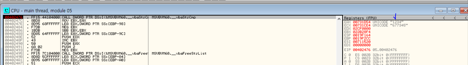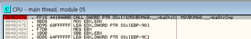 vbaStrCmp 함수 - BP 걸린 저곳에서 입력받은 값 vs 시리얼 값 비교 -> 같은지 판단할 것