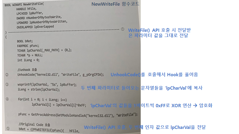 3. 암호화된 문자열을 저장할 때, NewWriteFile() 함수 내부에서 WriteFile() API를 호출해야한다. 그런데 지금 Hook이 걸려있는 상태이므로 정상적으로 호출이 이루어지기 위해서는 WriteFile() API 시작 지점에 설치된 Hook를 풀어야한다. 즉 Hook를 먼저 풀고, 암호화된 값을 두 번째 인자로 넣은 후에 WriteFile() API를 호출하면 된다.