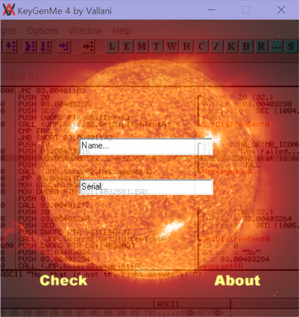 이름과 시리얼을 입력하고 체크를 누르면 되는 것 같아서 name부분에 CodeEngn을 넣어주고 serial에 아무거나 넣어주었다.
