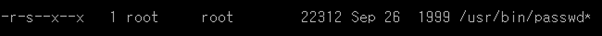 * /usr/bin/passwd 파일은 root에게 읽기와 실행(s는 x를 포함)이 있고, root라는 그룹에게는 실행 권한만 있으며, 나머지 사용자들에게는 실행 권한 만 있다. 하지만 root에게 SetUID가 걸려 있기 때문에 어느 사용자이던지 간에 파일을 실행할 때는 root권한을 갖게 된다.