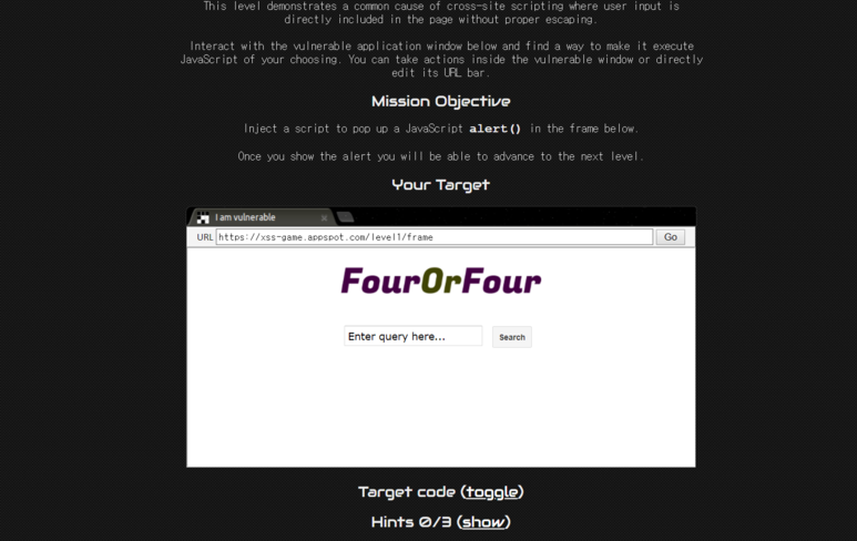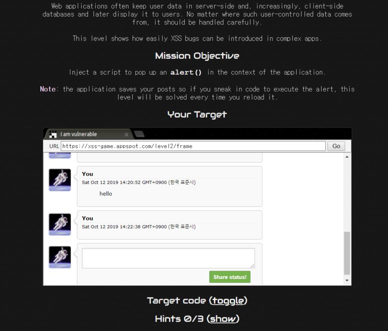Level 1은 alert()으로 팝업창을 띄우면 풀리는 문제입니다.