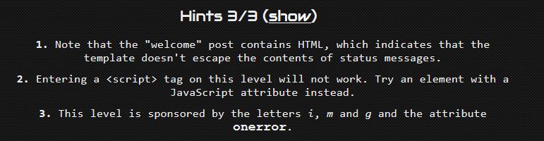 힌트를 보니 onerror 이벤트를 이용하라고 하였습니다.