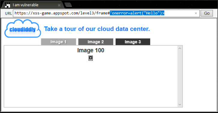 #뒤에 'onerror=alert("Hello")>를 입력해주면