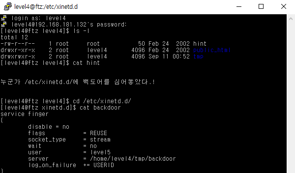 3. cat hint로 hint 내용 확인 => 누군가 /etc/xinetd.d/에 백도어를 심어놓았다.!