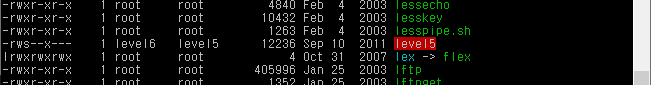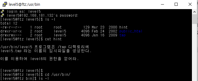 4. cd /usr/bin/으로 이동해 ls -l을 확인해주면 level5 파일이 존재하는 것을 알 수 있다