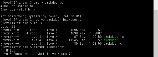 11. 위에서 backdoor는 finger 서비스로 실행된다는 것을 알려주었는데 여기서 finger 명령어로 @localhost를 입력하면 level5의 pw를 얻을 수 있다