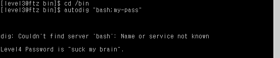 8. 즉 autodig “bash;my-pass”를 입력해주면 두 명령어가 동시에 사용되고 문자열의 형태로 명령어를 autodig에 전달해주면서 level4 권한을 가진 autodig에서 pw를 얻을 수 있다