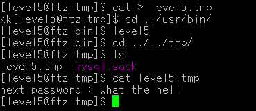 7.파일이 있으니 이제 level5를 실행시키기 다시 cd /usr/bin/으로 이동한 다음 cat 을 이용해 level5.tmp파일을 열어주면 level6에 대한 pw가 나타난다.