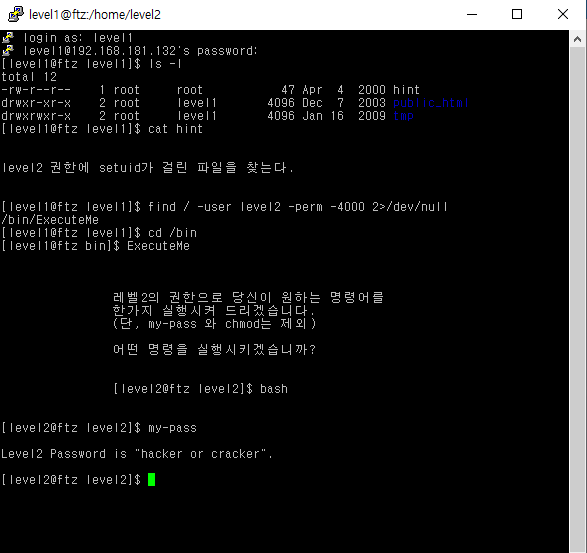 3. cat hint로 hint 내용 확인 => ‘level2 권한에 setuid가 걸린 파일을 찾는다’