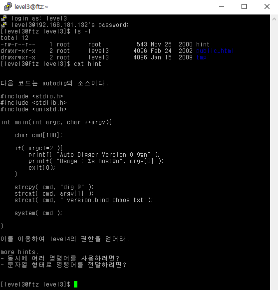 3. cat hint로 hint 내용 확인 => autodig의 소스 코드 주어짐