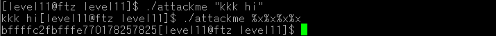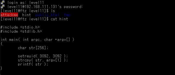 level11로 로그인 후 cat hint를 입력해 힌트 파일을 확인한다. ./attackme의 소스코드 같다.