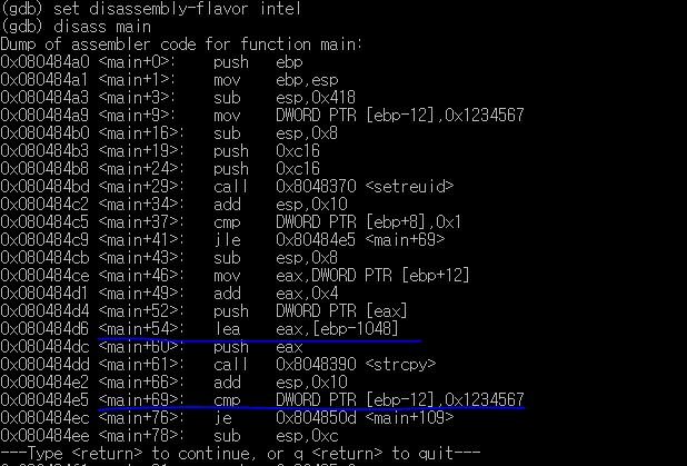 - <main+54>를 보면 buf와 ebp 사이의 거리가 1048임을 알 수 있다. buf와 ret의 거리는 4byte를 더한 1052byte일 것이다.
