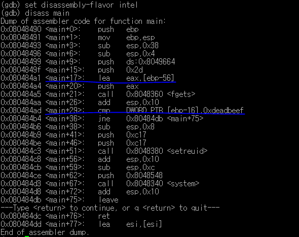 우리는 fgets 함수에 입력할 때 buf[20] 뒤 어딘가에 있을 check에 0xdeadbeef를 넣어주어야 한다.
