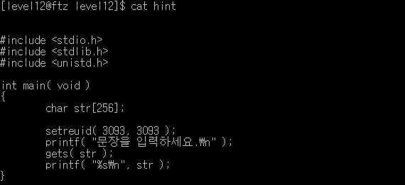 이번 소스코드는 level11과 다르게 argv[1]은 받지 않는다. 대신, 문자열의 길이를 제한하지 않는 gets 함수로 입력을 받기 때문에 이를 이용해 버퍼 오버플로우를 일으킬 수 있다. 우리는 gets 함수에서 입력을 받을 때 입력받는 주소와 ret 주소의 거리를 알아내고 ret 주소에 쉘을 실행시키는 코드를 작성할 것이다.