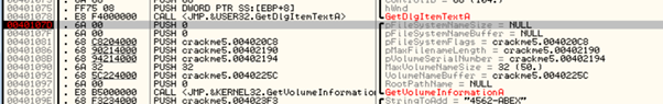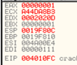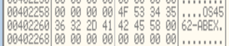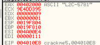EAX 레지스터에 주소 ‘00402000’ 이 저장된 것을 확인 할 수 있음. 이 주소에는 일련번호로 사용되는 문자열이 저장되어 있다.