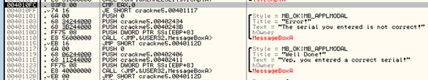함수의 실행 결과는 EAX 레지스터에 저장되며 일련번호와 사용자가 입력한 값이 같으면 0, 다를 때는 1이 입력된다.
