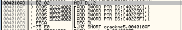 4. i>0 : 제로 플래그가 1이 아니면 004010AF로 점프.(반복문의 처음으로 다시 돌아가라)