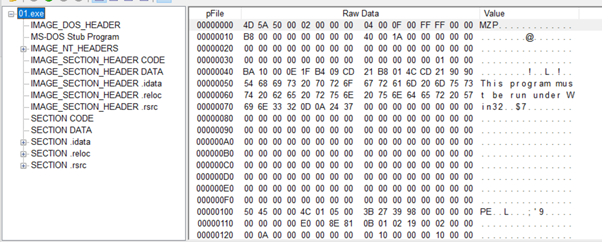 - MS-DOS Stub Program은 DOS 운영체제에서 윈도우용 PE 파일을 실행했을 때 보여줄 오류 메시지를 저장. PE 파일 내부에는 이와 같은 오류 처리를 위한 작은 DOS 프로그램 이 내장.