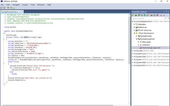 ConsoleAppllication3 - Root Namespace – RijndaelSimpleTest – Main 을 누르면 소스코드가 뜬다.