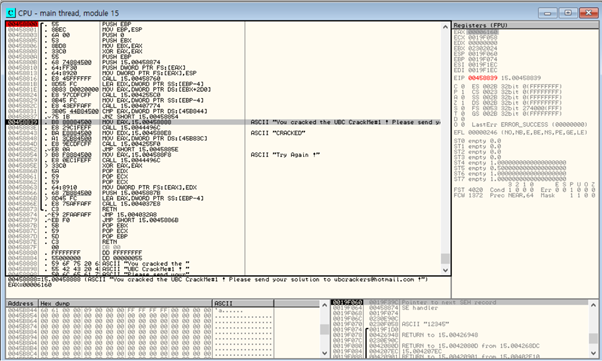 여기서 중요하게 봐야할 부분은 CMP EAX [EBP-3C] 부분임. EAX와 메모리 주소[EBP-3C]에 있는 4byte와 비교. JNZ 명령어는 비교함수의 두 변수값이 다를 경우 점프함. 점프할 경우 실패 문자열이 있는 주소이기 때문에 점프하지 않아야 성공 문자열 출력. EAX와 EBP를 알아내야함 CMP 부분에 브레이크 걸고 프로그램 실행