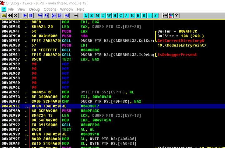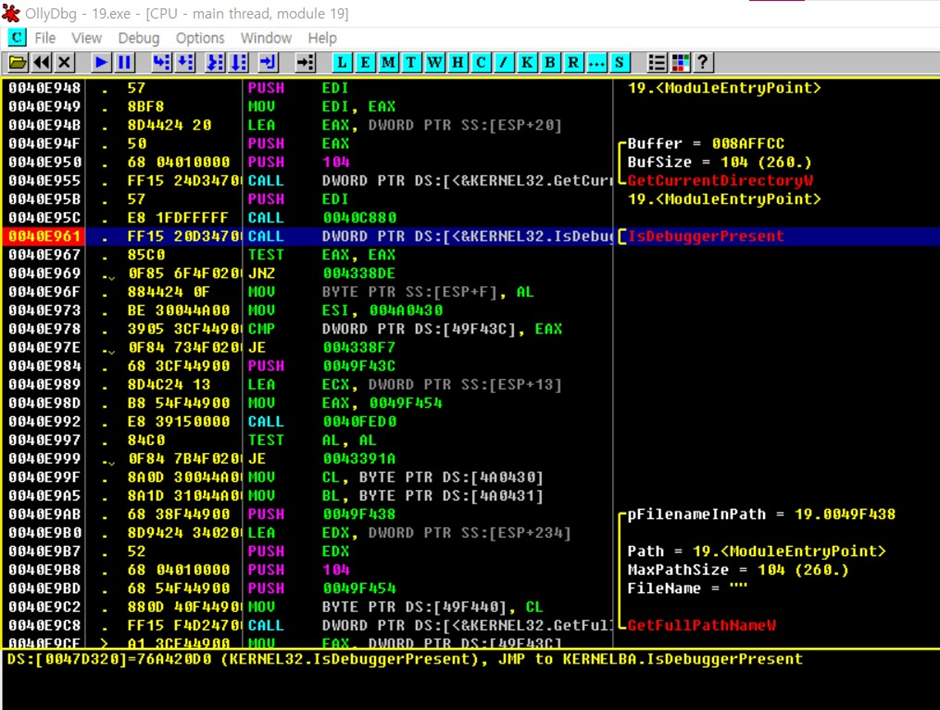 안티 디버깅 함수인 IsDebuggerPresent()을 확인