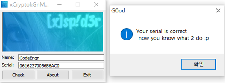 “You serial is Wrong, try again” 텍스트 아래에 성공 메시지 텍스트가 보인다.