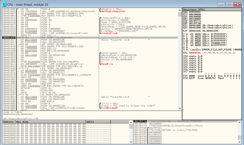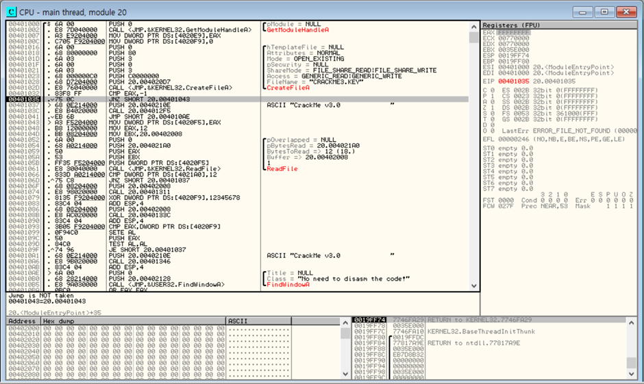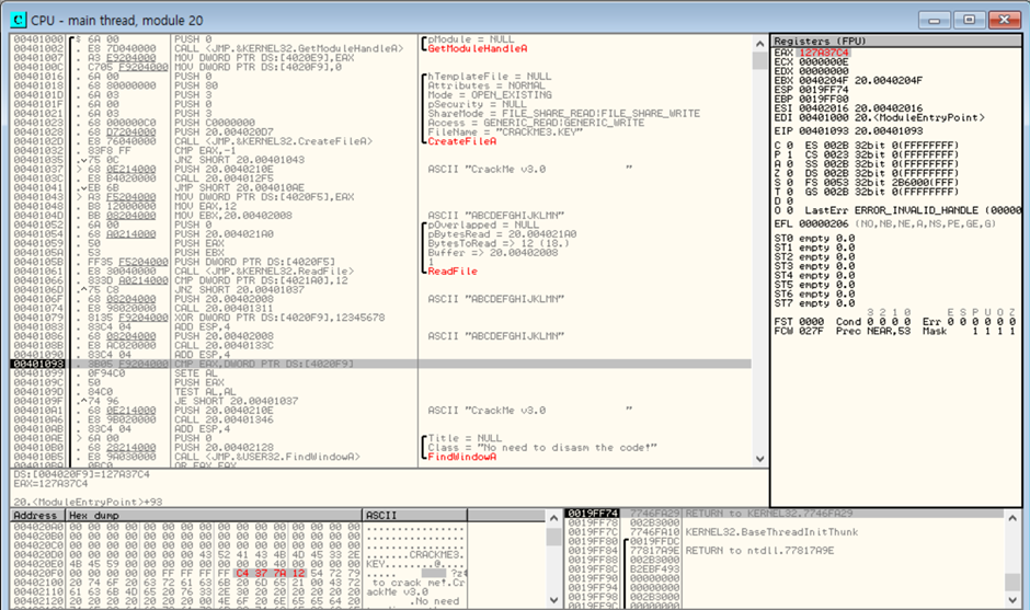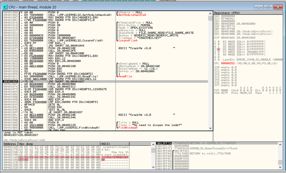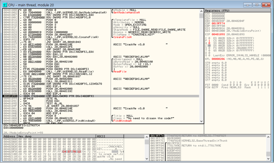 CreateFileA 는 CRACKME3.KEY 이름의 key 파일이 있는지 찾고 만약 있다면 EAX 레지스터에 -1값을 반환.