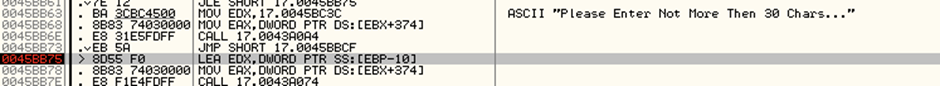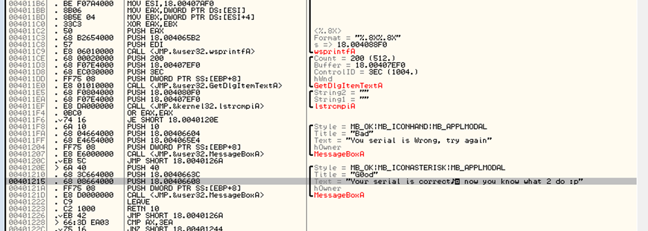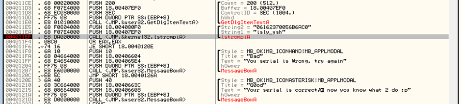 또한 “You serial is Wrong, try again” 텍스트 위에는 string2와 string1라는 두 문자열을 비교하는 함수인 IstrcmpiA 함수가 보인다. 이 부분에 브레이크포인트를 걸고 실행시켜보았다.
