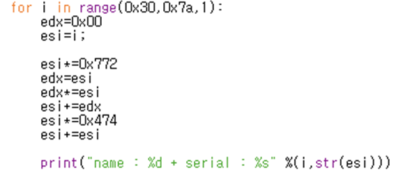 Call 0045b850이 시리얼을 만들어내고, 들어가보면 이부분을 통해 시리얼을 만들어낸다는 것을 알 수 있다. 따라서 해당 부분을 파이썬코드로 작성한다.