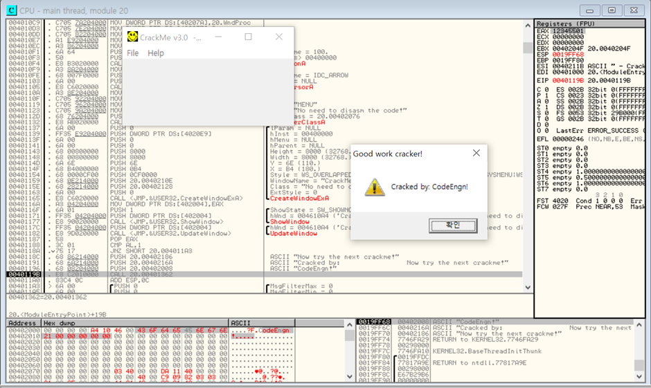 아스키 값을 CodeEngn!으로 고쳐준 후 실행시키자 문제 해결