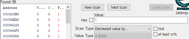 2-2. Value를 프로그램 내에서 바뀐 값으로 변경한 후(97) Next Scan 버튼을 누르면 딱 그 Value의 메모리 주소만 리스트에 뜨는 것 같다.(사진의 경우 여러번 시도해서 최종적으로 90으로 변경 후 Next Scan했음)