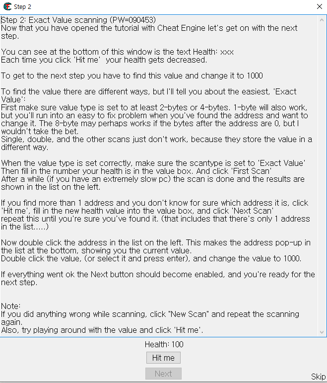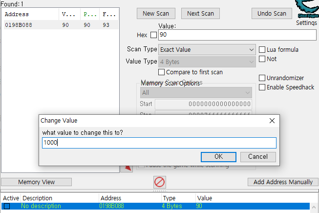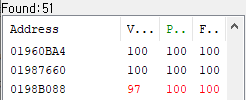 1. 일반적으로 C언어로 만든 프로그램들은 int형(4byte)을 많이 사용하므로 Value Type을 ‘4 Bytes’로 설정하는 게 편하다. Value는 프로그램에 나왔듯 100을 입력하고 Fisrt Scan하면 많은 address list를 볼 수 있다. 그럴 땐 프로그램에서 Change value 버튼을 눌러 어느 address가 변하는지 확인하여 원하는 address를 찾을 수 있다. 찾았다면 더블클릭하여 아래에 추가한다.