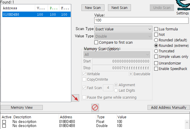 2. New Scan을 누른 후, Ammo의 value를 찾기 위해서 Value Type을 ‘Double’로 설정해주고 Value에 100을 입력해 First Scan한다. 이번에도 운좋게 해당 address를 바로 확인할 수 있었다. 마찬가지로 더블클릭하여 아래에 추가한다. 만약 여러 address list가 뜬다면 프로그램을 실행해 값을 변경해주어 Value가 이벤트에 맞춰 바뀌는 address를 찾으면 된다.