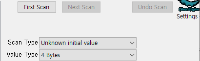 1. 우선 우리가 아는 값이 없기 때문에 Scan Type을 ‘Unknown initial value’라고 지정한 후 First Scan을 누르면 (당연히) 엄청난 수의 address list가 뜬다.